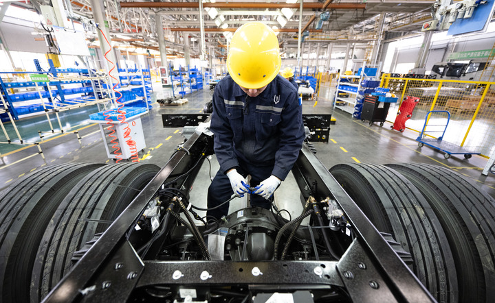 2月13日,工人在程力專用汽車股份有限公司新能源商用車底盤裝配線上作業。新華社記者肖藝九攝