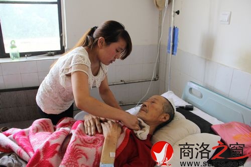 商洛日報訊(趙有良 李亮)6月23日下午3點,商洛市中心醫院內科病房里,李蕾蕾正在為他的養父李拉柱擦洗身體,每擦一處,就擺洗一下毛巾,擺洗幾下之后將臉盆里的水端出去倒掉又換上干凈的水。等擦洗完畢,這個20歲的女孩額頭上已滲出了汗水。本是八九個人的病房,一時間靜悄悄的,大家都將目光關注在這個女孩身上。70多歲的老人、40多歲的中年男人,眼里滿含淚花地看著這個素不相識的女孩如此細致而又熟練地照顧著她的養父。