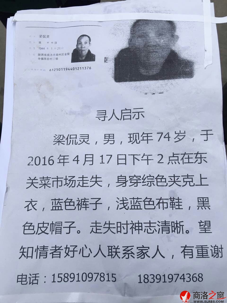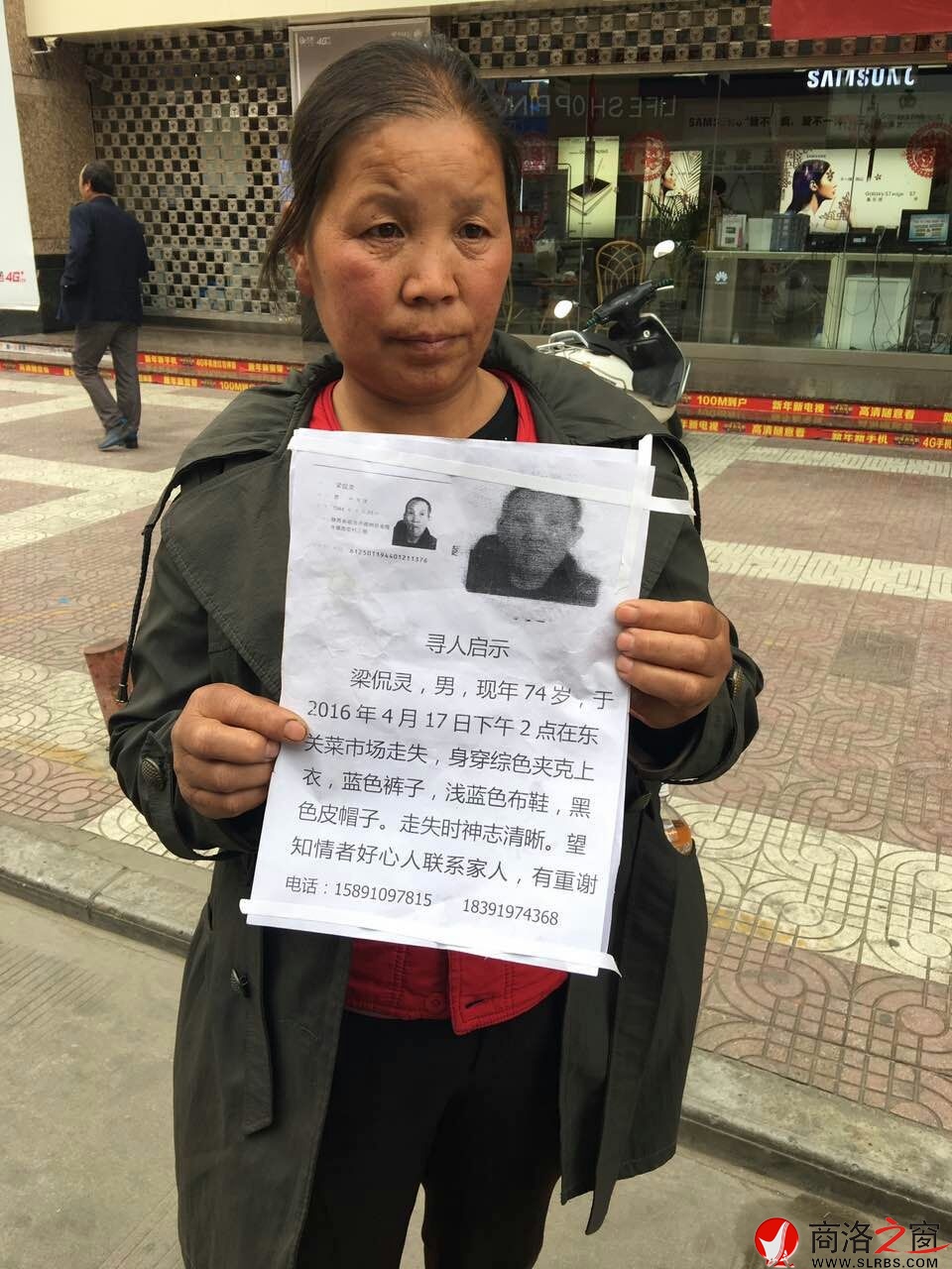 商洛之窗訊(李少虎 王孝竹)4月19日,記者在商州區金鳳路遇到兩名中年女子拿著打印的黑白尋人啟事緩步而行。據了解,她們的老人梁侃靈今年74歲,金陵寺人,于17日下午在商州區東關菜市場附近走失。這兩名中年女子分別是走失老人的侄媳婦和女兒。她們與老人的其他兩個女兒已經這樣在商州區的各個道路尋找了三天未果,希望知情者與她們聯系,早日找到家人。 聯系電話:15891097815 18391974368