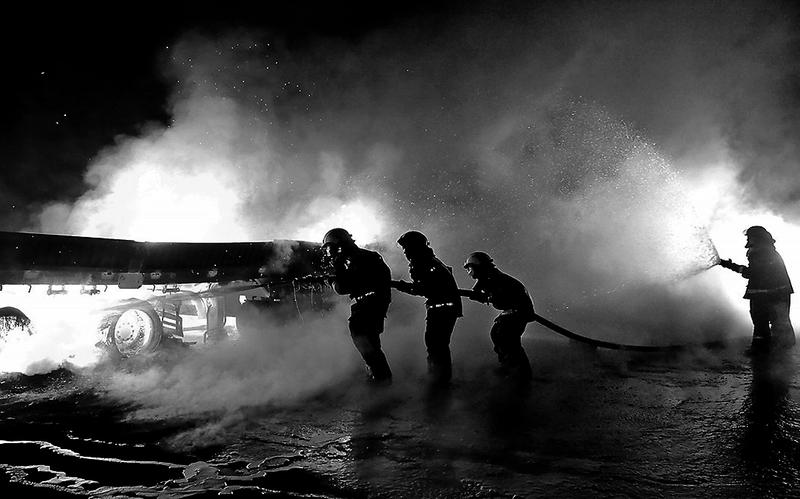 消防官兵立即展開撲救,大火終于在清晨5時許被撲滅,貨車被燒報廢,未燃燒的聚乙烯塑料高溫融化后覆蓋了大片路面。明火熄滅后,消防官兵對大貨車進行冷卻,防止再次復燃。經過三個多小時的高溫炙烤和連續作戰,參戰的消防官兵累倒在路邊就地休息。