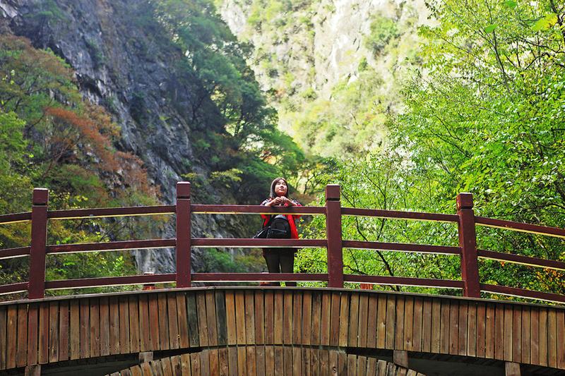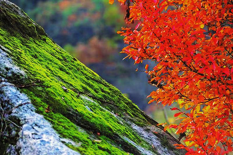 秋天的紅葉是金絲峽別致的封面,金絲峽地處秦嶺南麓,四季分明、資源豐富,森林覆蓋率高達98%,成為秦嶺最早出現紅葉的地區。由于金絲峽植物資源豐富,種類多樣,每年10月中旬至11月下旬,除了最常見的紅葉李、五角楓等,還有金燦燦的銀杏、紅黃相間的火炬樹、深棕色的銀紅槭、深紅色的黃連木等,共同組成了一幅絢爛奪目“紅葉山水”圖。放眼望去,有的樹葉紅得發亮,有的樹葉紅黃相間,有的樹葉黃得透亮,還有的綠瑩瑩的。秋風吹過,一團團顏色一起舞動,仿佛是在歡迎著遠道而來的客人。