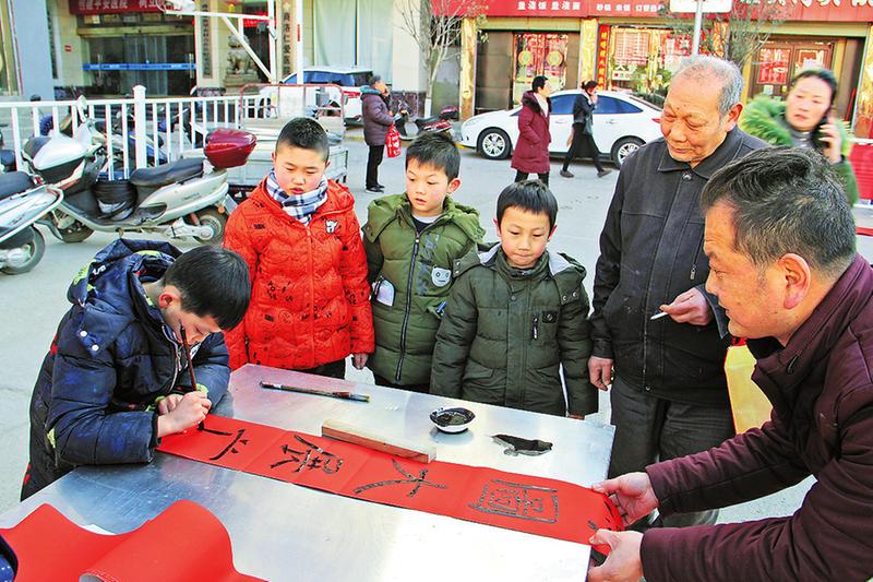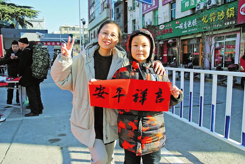 在活動現場的一個角落,10歲的男孩劉子浩正在認真地書寫著春聯。“這娃字寫得確實好,將來肯定有出息。”圍觀群眾紛紛夸贊。就連一旁正在書寫春聯的老師也過來看,“嗯,不錯,運筆好,基本功扎實”。一個十二三歲的女孩路過,看著寫春聯的男孩,對一旁的媽媽說:“媽媽,我也要學習書法。”劉子浩在城關二小讀書,練習書法3年多時間,除過自學,在學校還參加了書法幸福課堂。“因為我愛好書法,所以一直在堅持,希望將我們中國的傳統文化發揚光大。”劉子浩說。