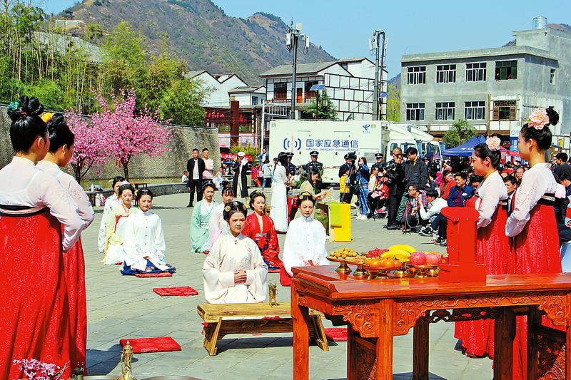 當天的開幕式現場,最引人注目的便是花朝節祈福儀式了。20多位身著傳統漢服的女子端莊肅穆,手執禮器、扇子、各色祭品,在贊禮官的引導下,主祭、參祭等依次參拜花神,將傳統文化的魅力展現得淋漓盡致。現場觀看的王女士告訴記者:“今天帶著孩子一起來桃花谷游玩,正逢桃花節開幕,第一次了解了花朝節這個節日,也和孩子一起感受到中國傳統文化的獨特魅力,感覺特別棒!”