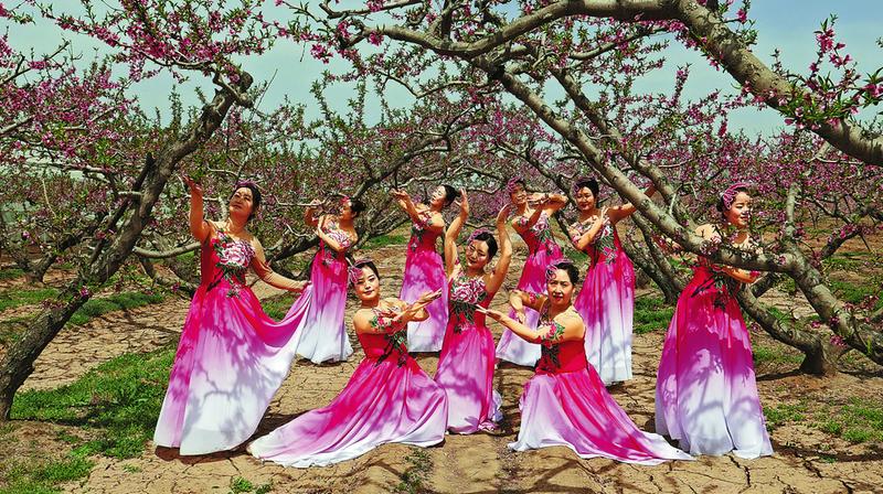 在鮮花盛開的桃樹林里,十幾位穿著民族服裝的女子正在三五成群地分批表演《山清水秀太陽高》,音樂優(yōu)雅,舞姿翩翩。一位帶著孩子的女游客以為她們正在錄制電視節(jié)目,抱著孩子和參加表演的小張瑜合影,原來她把美麗的小張瑜當(dāng)成了專業(yè)演員。