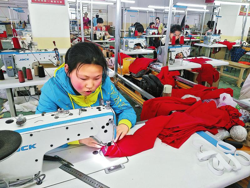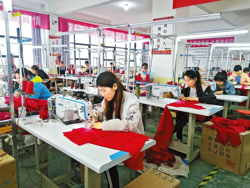 5月28日,工人正在陜西永干鈺服飾公司車間加工服裝。該公司是洛南縣返鄉創業青年齊永寬于2018年10月注冊成立的一家集研發、生產、銷售為一體的服裝企業,計劃總投資3000萬元,目前已投資1000萬元建成一期廠房3000多平方米,吸納67名農村勞動力就業,月平均工資2200元。