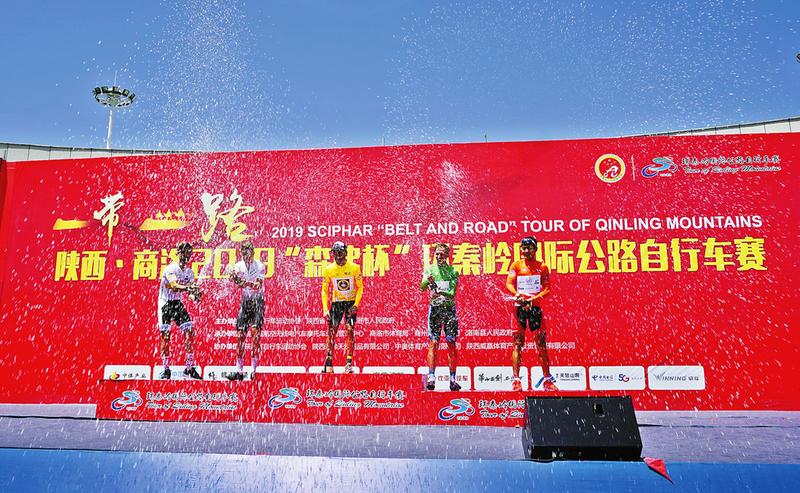 6月3日,“一帶一路”陜西·商洛2019“森弗杯”環(huán)秦嶺國(guó)際公路自行車(chē)賽正式開(kāi)賽。在城市繞圈賽職業(yè)男子組頒獎(jiǎng)典禮現(xiàn)場(chǎng),獲獎(jiǎng)選手站在領(lǐng)獎(jiǎng)臺(tái)上,紛紛噴灑手中的香檳,與現(xiàn)場(chǎng)觀眾一起慶祝勝利。(黨率航 攝)