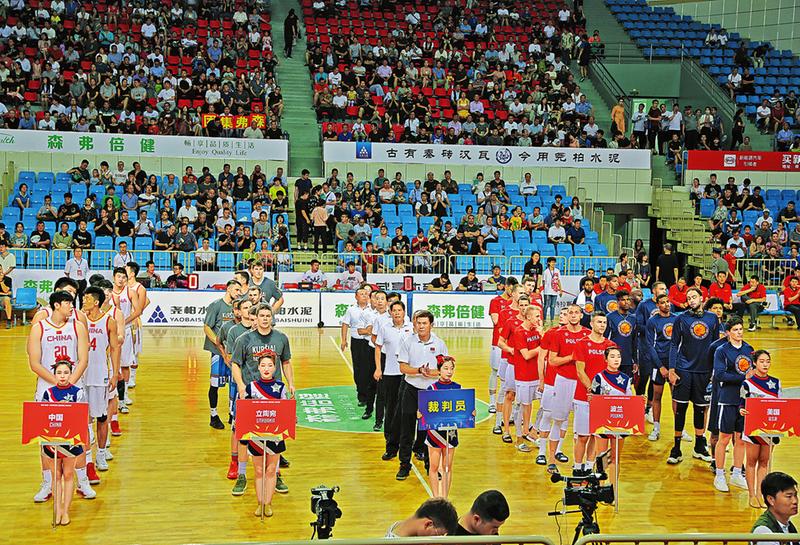 6月18日晚,2019“森弗杯”國際男籃挑戰賽在市體育館開賽,比賽開始前,4支參賽球隊和裁判員團隊共同參加開幕式。