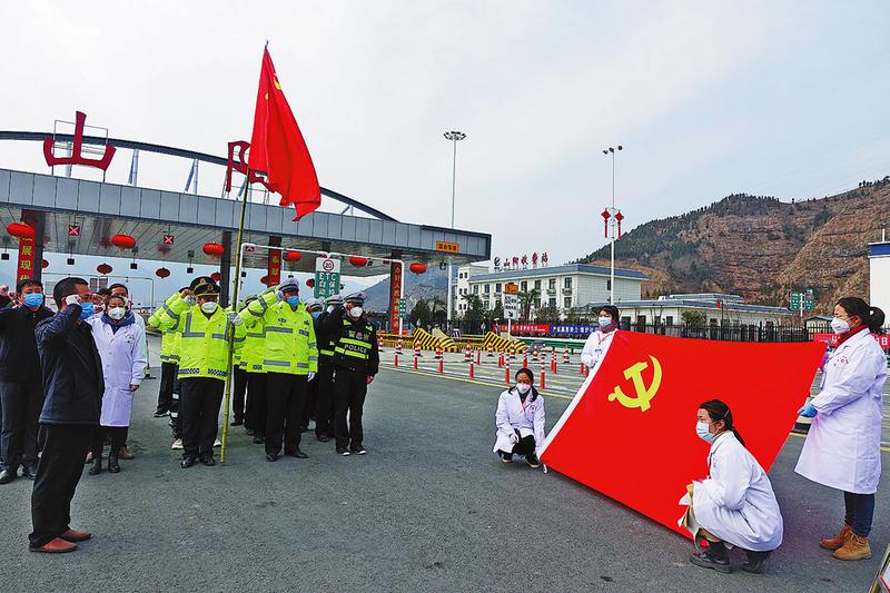 2月1日,山陽縣首個抗擊疫情臨時黨支部暨山陽縣城關街道高速出口疫情防控檢查站臨時黨支部,在高速出口(水陽收費站)疫情防控檢查站成立。來自城關街辦、縣交警大隊、縣交通運政所和城關衛生院等部門(單位)的39名黨員堅守在疫情防控執勤站,面對鮮紅的黨旗,舉起右手莊嚴宣誓,堅決打贏這場疫情防控阻擊戰。(蔡銘 攝)