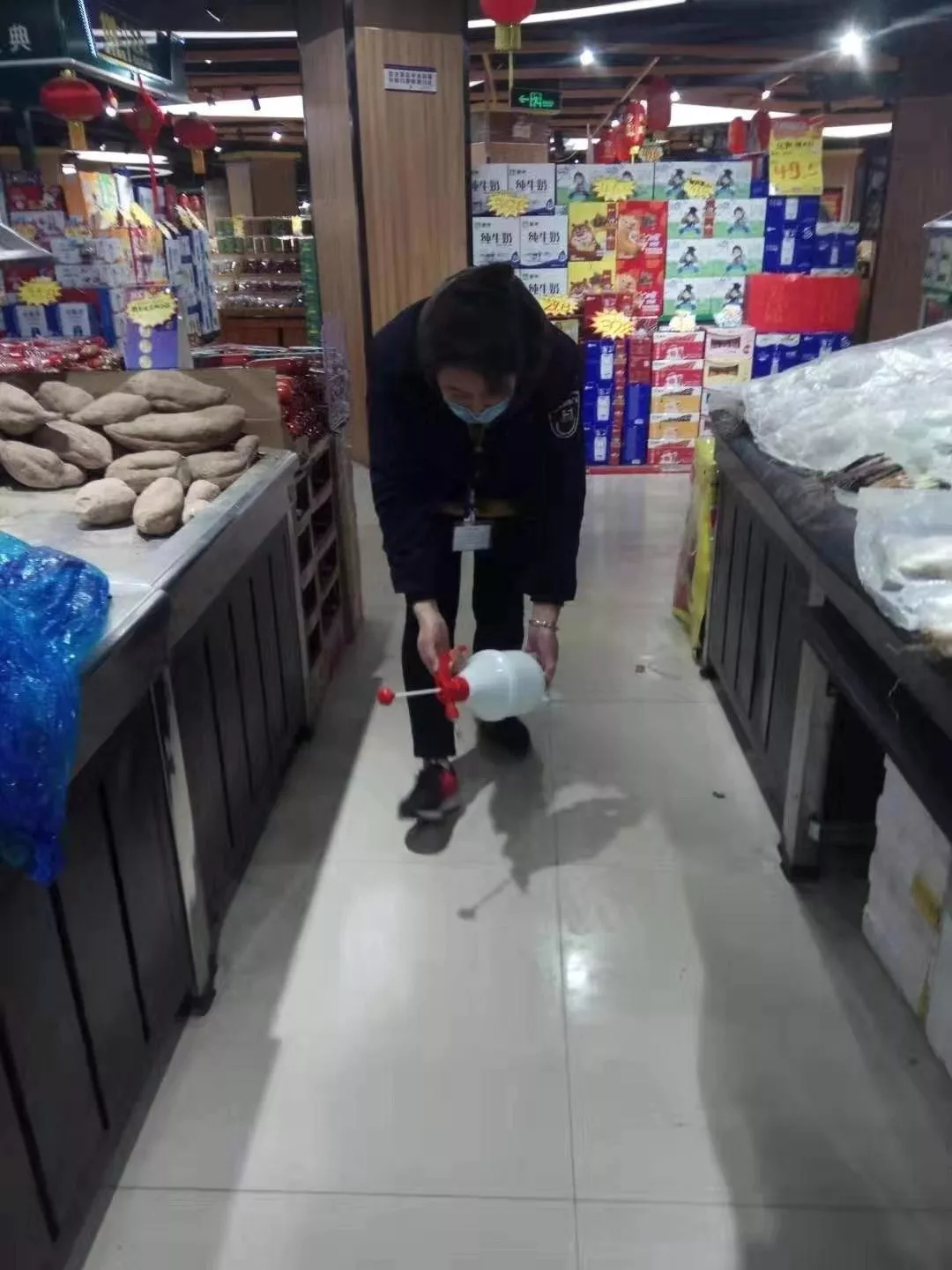 五洲超市工作人員對(duì)超市主要通道進(jìn)行消毒