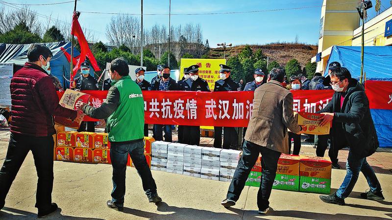 2月18日至19日,商南縣秀水建材市場的114家愛心商戶,先后來到湘河、清油河、試馬等地,向堅守在22處監測點的一線工作人員送去愛心物資。(杜金暉 攝)