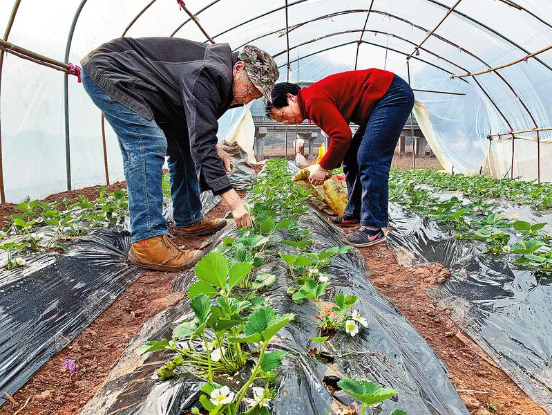 板橋鎮(zhèn)郝曉權(quán)(左)在草莓田里除草?市區(qū)公交車恢復(fù)運(yùn)行