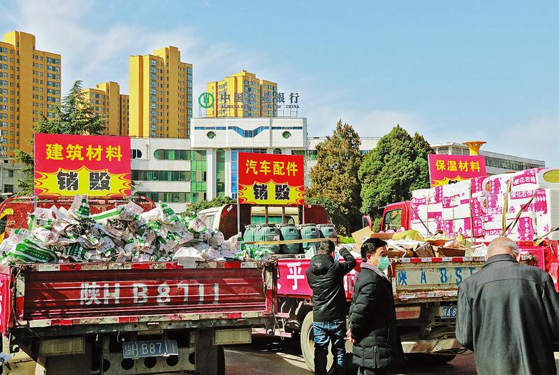 活動現場,工作人員受理消費投訴舉報,開展消費教育引導,指導消費者識別假冒偽劣商品,普及消費維權等法律知識。活動中,商州區把一年來案件查辦收繳的十大類11469件假冒偽劣和過期商品進行展示,隨后運往垃圾填埋場進行集中銷毀填埋。(胡蝶 攝)