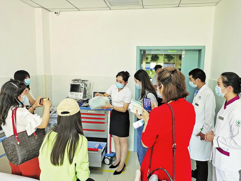 工作人員向媒體人介紹醫院設備