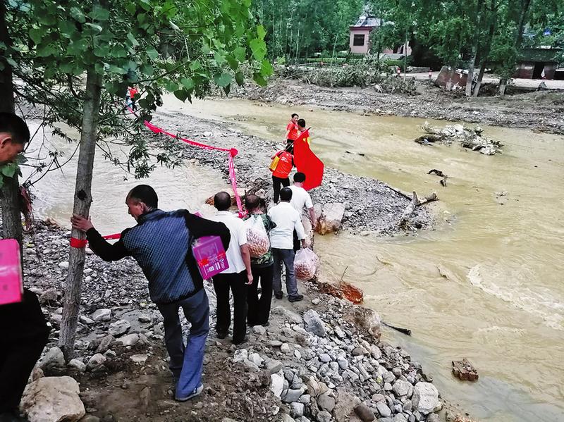 接下來幾天,王橋村、三岔村、楊河村、花廟村、東山村、橋河村、留題村、張灣村的志愿者紛紛在各村黨支部的帶領下,背著救災物資,翻山嶺、爬斷橋、趟河流,不怕艱險,為太白岔村送去急需救援物資。這些志愿者中年齡最大的60多歲、最小的15歲,他們腳磨破了,手劃傷了,但他們沒有退縮,第二天繼續運送救援物資。