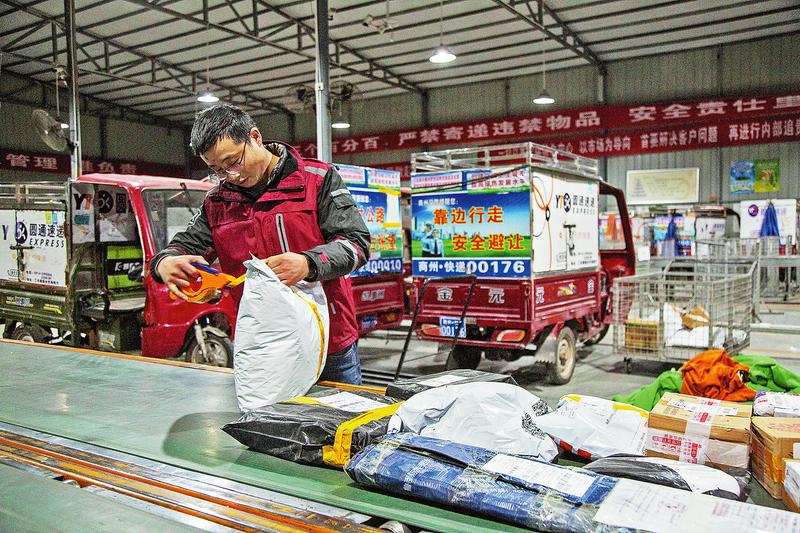 在圓通快遞商州集散中心,負責分揀的人員正將明日要派送的快遞從傳送帶上依次分揀出來,帶頭干活兒的就是業(yè)務主管郭輝。