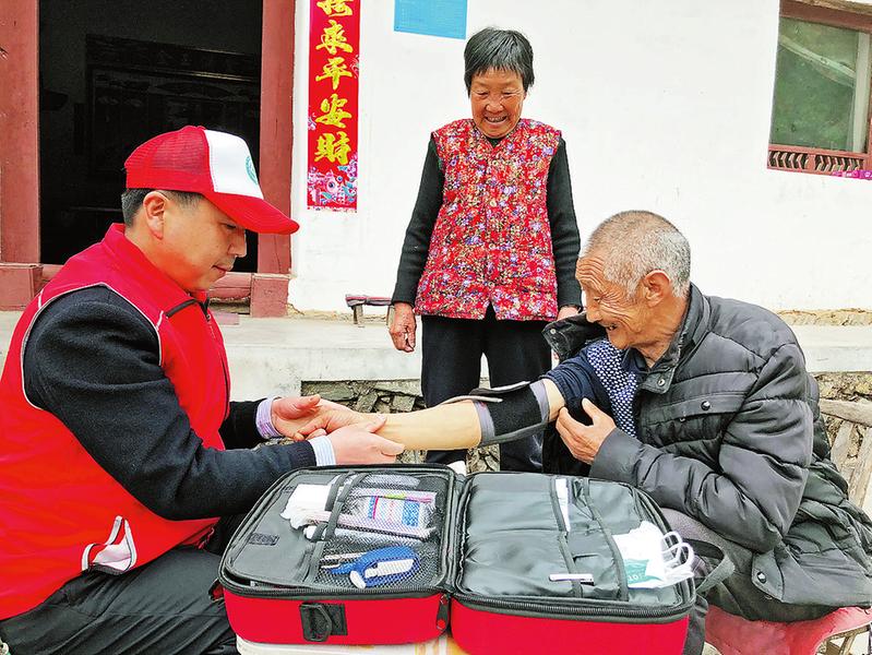 “血壓還是有點高,降壓藥要按時吃,平時注意休息,吃飯要少鹽低油,其他都好著,您放心吧!”4月15日,在山陽縣高壩店鎮魚塘村,村醫孫立軍在對村民陳天喜進行隨診服務時,為其認真測量血壓后,細心叮囑他如何用藥和注意事項。