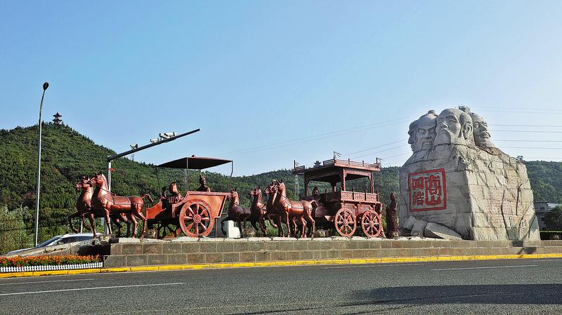 商山四皓主題雕塑位于市區南大門商洛西高速出入口,由秦末漢初的四位隱士東園公、綺里季、夏黃公、甪里先生及車馬組成。商洛歷史悠久,文化底蘊深厚,倉頡造字、商鞅封邑、闖王屯兵,每一部史詩都傳承著這座城市昂揚向上的精神。在眾多的歷史人物中,商山四皓以獨特的行為方式和豐富的文化內涵被世代傳誦。商山四皓是商洛歷史文化的一張名片,為商洛旅游和經濟發展增添了軟實力。 (記者楊森 攝)