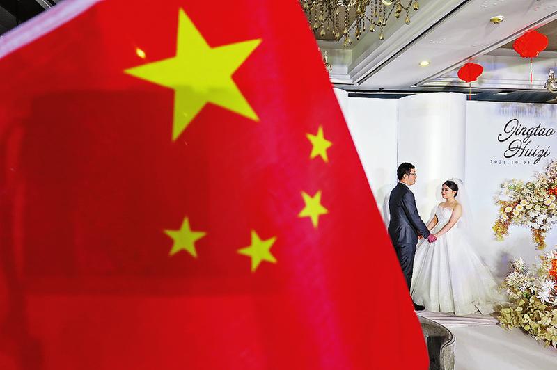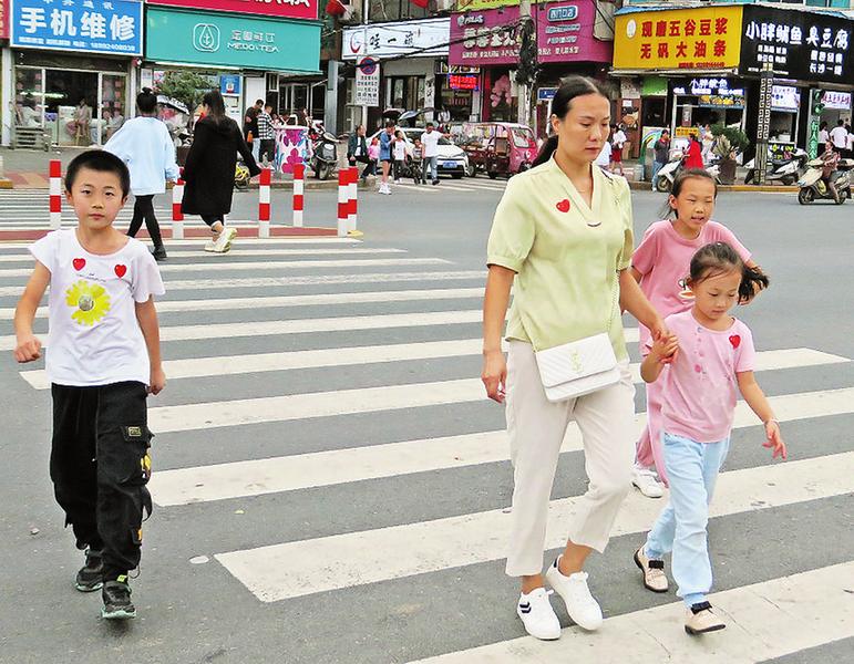 10月2日,在商洛供電公司門前,一個女孩在教弟弟向國旗敬禮。(記者 方立攝)...
