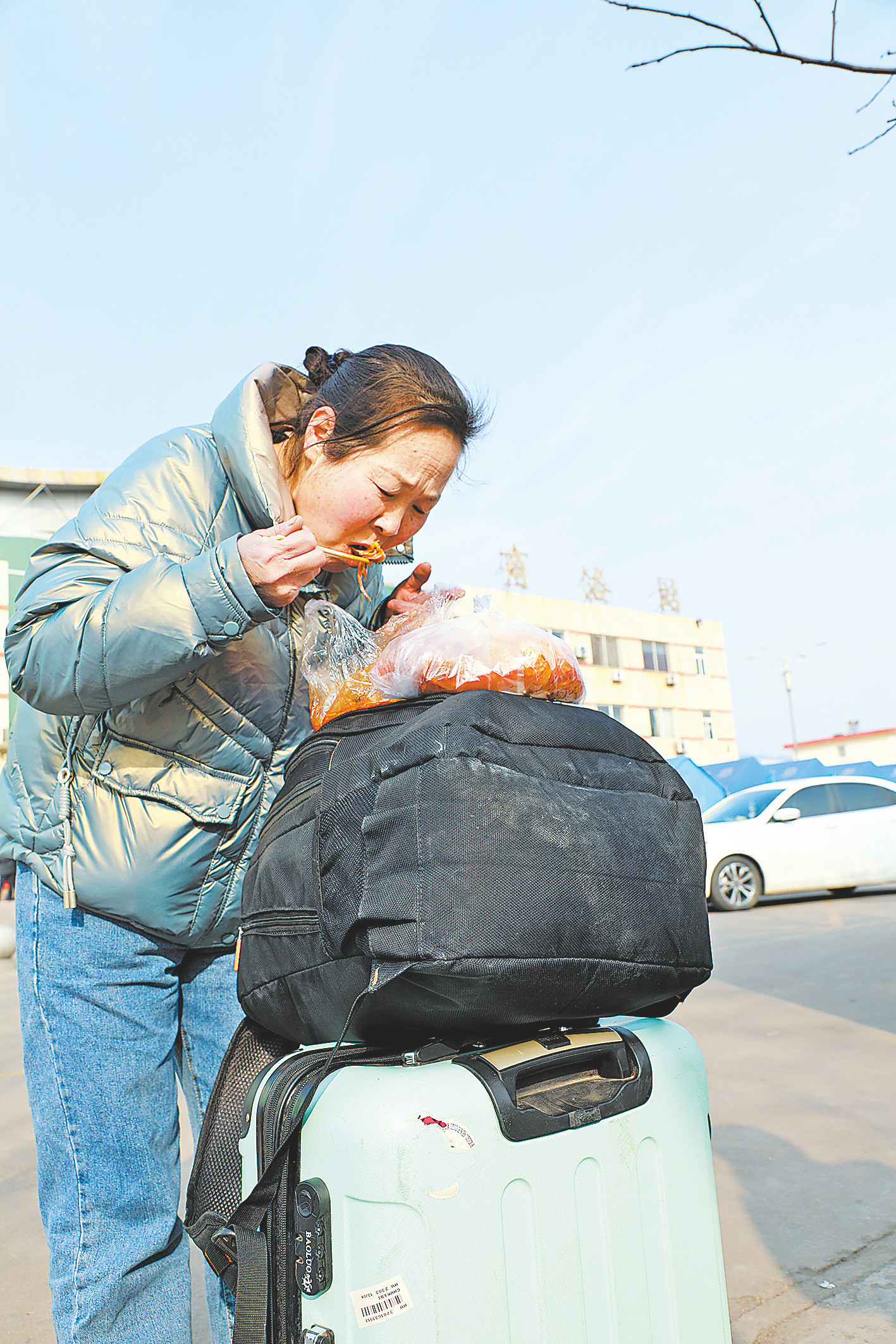 2月11日,是張俊霞決定動(dòng)身的日子。前一天晚上,她把買的炸果子、豆腐干、柿餅分成了兩份,給自己帶上一份,給女兒裝上一份。行李箱已經(jīng)裝滿了,可她依然不想放棄任何一件,來來回回取出來又放進(jìn)去,試著擠出更多空間。最終,兩個(gè)行李箱塞得滿滿當(dāng)當(dāng)。