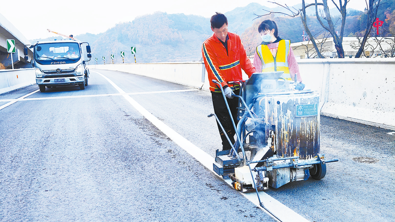 在山陽縣高壩店鎮丹寧高速施工3標段現場,嶄新的標識標牌十分醒目,主干道上,有工人正在畫標線、清掃路面。