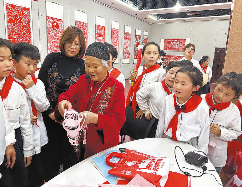 “這位80歲的老人是洛南剪紙的代表,她是一位真正的民間剪紙高手,不用刻、不用畫,僅憑心中的口訣就能剪出特別棒的作品,是我們平時都沒見過的,讓我們一起來了解不一樣的剪紙藝術。”在王利娜的引導下,孩子們來到了洛南縣剪紙非遺傳承人李便彩的身邊。李便彩耐心地給孩子們教完五角星和“囍”字的剪法,便又迫不及待地向孩子們傳授“雙蝶采梅花”的疊紙及剪紙方法。