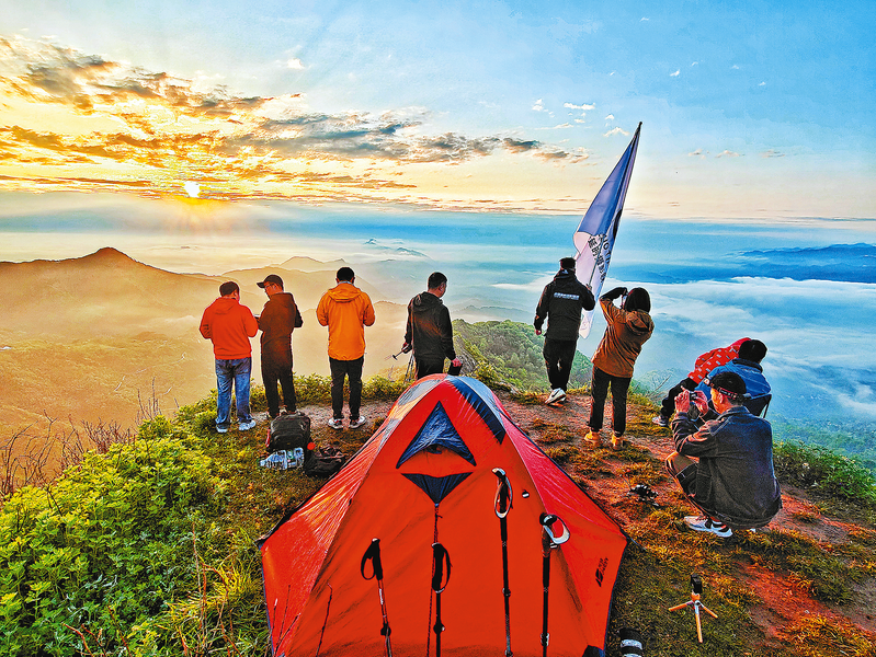“五一”假期,許多游客選擇以露營的方式樂享假日時光。圖為5月5日,游客在商州區金陵寺鎮熊耳山露營觀賞云海美景。 (本報記者 楊 鑫 攝)