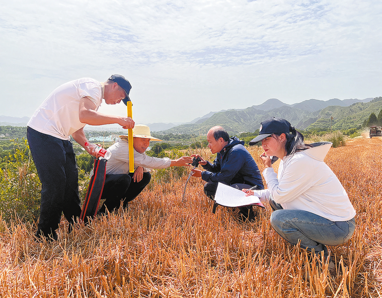 5月31日,在丹鳳縣棣花鎮兩嶺社區,市農業機械化管理局的同志正在測算小麥機收損失率,并為糧農做好技術指導。