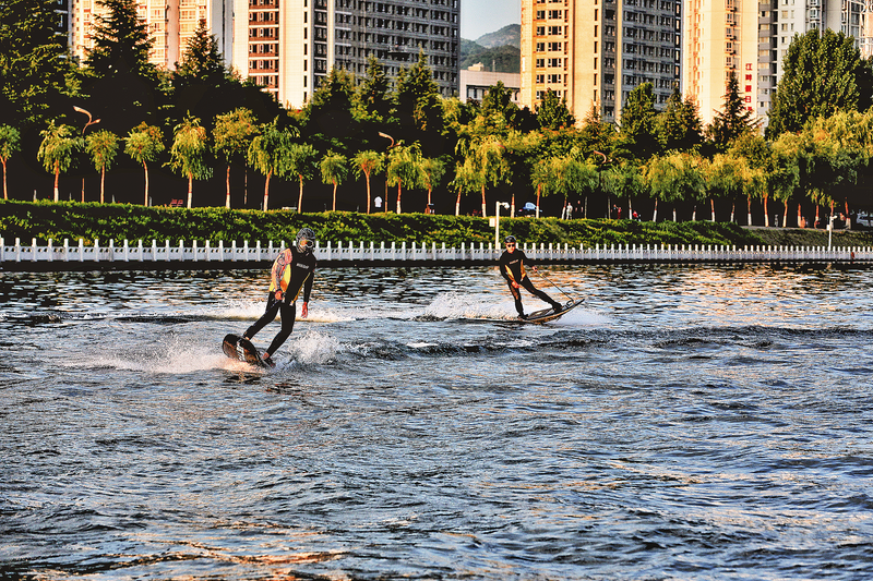 “哇!媽媽快看,好酷呀!水也動起來了!”6月11日,在市區兩河口城市運動公園里,小朋友周鑫鑫指著河面上或飛馳,或跳躍的沖浪人喊道。只見不遠處的寬闊水域中,兩名腳踩沖浪板的小伙子在水面上來回穿梭著,讓原本平靜的水面泛起陣陣浪花。