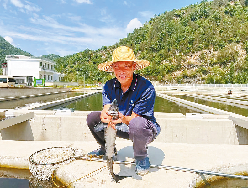 6月18日,國漁三岔河水產(chǎn)養(yǎng)殖示范園捕魚工抱起剛捕捉到的冷水魚。 (本報通訊員 唐宇琨 攝)