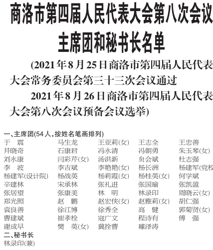 本報訊(記者 余婷)8月26日下午,商洛市第四屆人民代表大會第八次會議主席團舉行第二次會議。大會主席團常務主席張凱盈主持會議,主席團其他成員出席會議。 會議應到54人,出席53人,出席人數符合法定人數。 ...