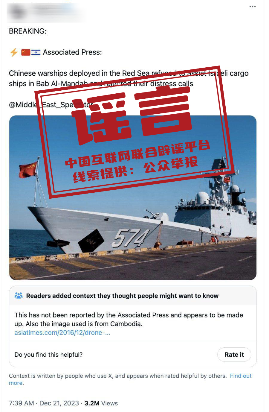 真相:針對“一艘以色列商船向中國海軍烏魯木齊艦進行求助遭到拒絕”的報道,國防部新聞發言人吳謙在12月28日的例行記者會上回應,這是徹頭徹尾的假消息。另據新華社25日報道,一個有十多萬“粉絲”的境外社交平臺賬號以美聯社為“信源”發帖稱,“中國軍艦在曼德海峽拒絕協助以色列貨船,且無視他們的呼救。”這一謠言隨即被多個權威信源辟謠。事實上,美聯社根本沒有這則報道。(來源:中華人民共和國國防部、新華社)