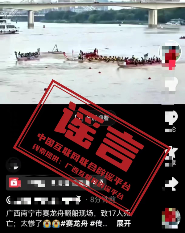 真相:近日,有網友在短視頻平臺發視頻稱“南寧市賽龍舟翻船致人員傷亡”。經廣西壯族自治區南寧市互聯網舉報辟謠平臺向南寧市體育局核實,大賽期間,南寧市紅十字會、南寧市應急管理局和消防救援支隊安排50余名持有救生員資格證的救生人員、10臺救生艇隨時待命,比賽期間發生賽艇傾覆的緊急情況后,應急救援隊第一時間組織救援力量開展施救,成功地將傾覆的賽艇和落水運動員一一救起,未致人員傷亡。網傳“南寧市賽龍舟翻船致人員傷亡”系謠言。(來源:廣西互聯網違法和不良信息舉報、“南寧舉報辟謠”微信公眾號)