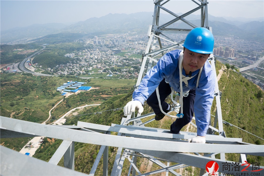 商洛之窗訊  7月30日,在攝氏40°高溫下,陜西商洛供電公司員工在30米高的鐵塔上揮汗作業。他們奔走在峻嶺之巔的鐵塔上、銀線間,用勤勞和勇敢“編織”著輸送光明的電網。