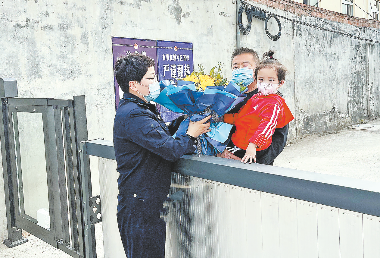 3月8日,在丹鳳縣看守所門(mén)外,3歲小女孩毛毛使勁地?fù)]動(dòng)著自己的小手,想抓住媽媽的警服,讓媽媽跟她一起回家。