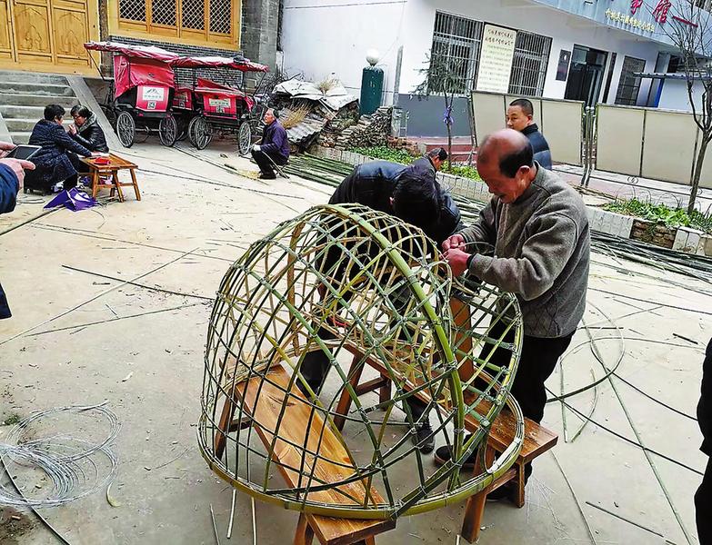 丹鳳縣的竹林關因竹子多而得名。銀花河畔、桃花谷間、村莊邊緣,隨處可見修長的翠竹。篾匠劉彩堂告訴記者:“龍燈的骨架是用竹子做成的,一般做一個龍頭,需要50斤竹子。”劉彩堂今年55歲,做得一手好蔑活。只要村上做花燈,劉彩堂都會前去幫忙,單是竹子的挑選,就有很多講究。斑竹不行,新鮮的、直徑4厘米、竹節長的水竹才適合做骨架,這樣的竹子破出來的竹篾韌性好,更易彎曲。做骨架時,劉彩堂用篾刀將竹子先劈成二分之一,再到四分之一、八分之一,制成合適的竹篾。下一步,就可以制作骨架了。