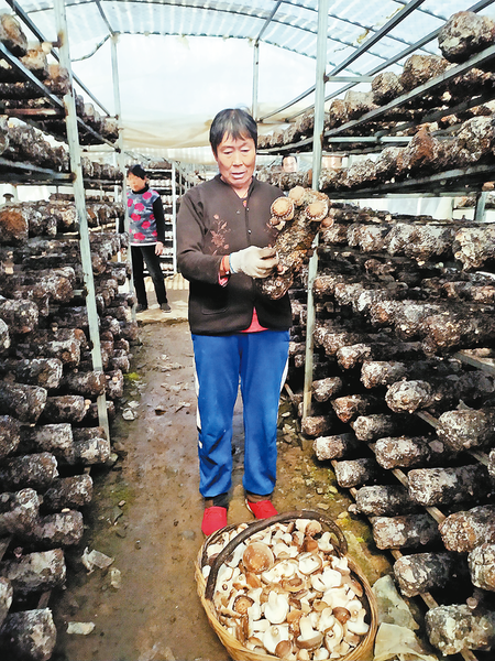 省人社廳駐陽陰村第一書記、駐村工作隊隊長顧險峰查看香菇長勢。