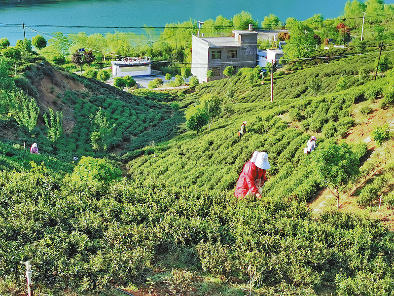 近期,丹鳳縣竹林關鎮千畝茶園基地內,處處抽芽吐綠,一片生機盎然。為保證茶園第一批春茶品質和茶葉下樹率,農技人員和茶農正加足馬力,進行茶葉采摘工作。 (本報通訊員 王 磊 攝)