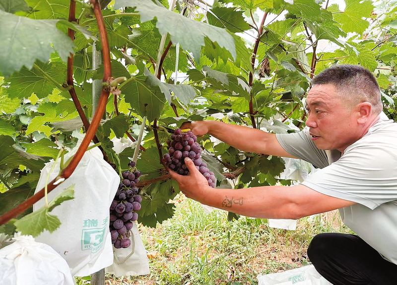 立足土壤濕潤(rùn)、光照充足的優(yōu)勢(shì),黑溝河村確定“葡萄為主、櫻桃和仙桃為輔”的產(chǎn)業(yè)定位,通過(guò)引進(jìn)優(yōu)質(zhì)種苗、建立育苗基地、開(kāi)展嫁接改良,推動(dòng)產(chǎn)業(yè)向“規(guī)模化、品牌化”轉(zhuǎn)型。同時(shí),村里盤(pán)活撂荒地、升級(jí)產(chǎn)業(yè)大棚,創(chuàng)新采用“入股聯(lián)營(yíng)、土地流轉(zhuǎn)、租賃經(jīng)營(yíng)、勞務(wù)承包、代管服務(wù)”的“五型聯(lián)結(jié)”模式,建成集“生產(chǎn)—儲(chǔ)存—銷(xiāo)售”于一體的現(xiàn)代農(nóng)業(yè)園區(qū),成功打響“黑溝河葡萄”品牌。