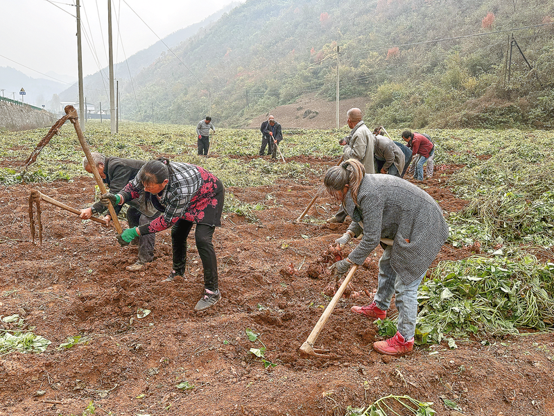 一顆顆飽滿紅潤的蜜薯破土而出,田間地頭一派火熱的采收景象。村民彎腰忙碌,割蔓、刨挖、分揀、裝筐,空氣中洋溢著豐收的喜悅。“這片地挖得快的話,也得3天挖完。”57歲的脫貧戶陳桂娥說,“今天家里沒事,來打個零工,掙個零花錢。”