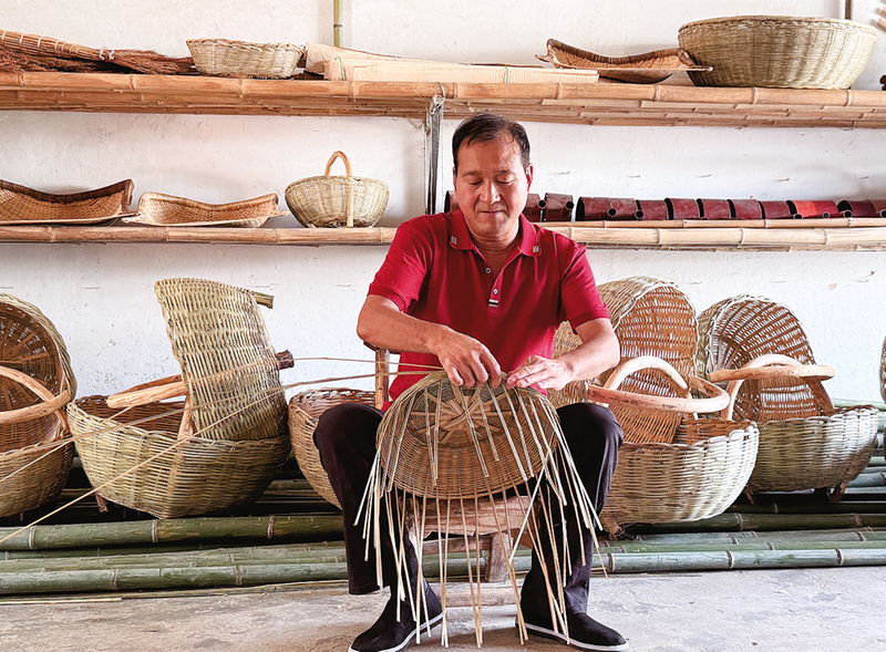 張新民正在編制竹籃