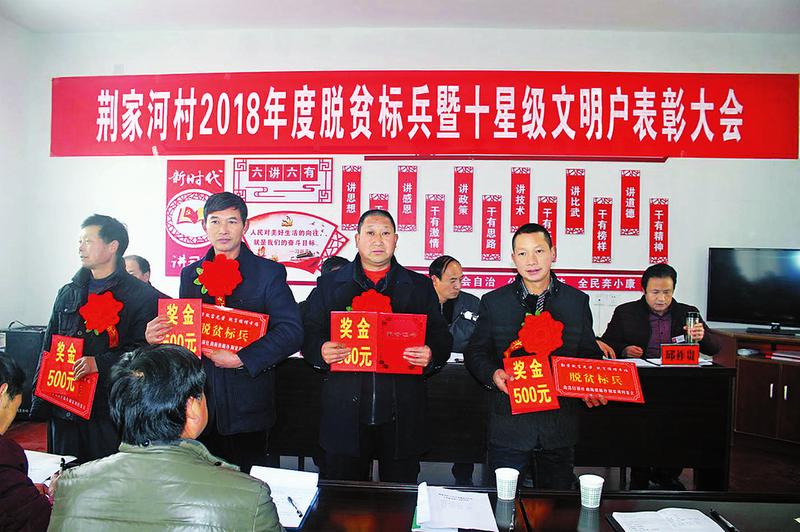 去年以來,在學習宣傳中、省、市和縣鎮先進典型的同時,我們高度重視身邊先進典型的培養、指導、挖掘和宣傳工作,僅2018年就在全村107戶貧困戶中打造出4個脫貧標兵。一是黨員脫貧帶貧標兵何衍杉。作為一名退伍回村黨員,他2014年被識別為貧困戶,在包扶干部幫助下依靠發展藥材種植,2017年就脫了貧,脫貧后他不忘黨恩,成立“寶豐中藥材專業種植合作社”,吸納17戶群眾種植藥材,幫帶7戶貧困戶陸續脫貧,受到了商南縣領導的夸獎。二是自強自立的獨臂漢子汪仁喜。他16歲時不慎失去右臂,2017年被識別為貧困戶,但他依靠黨的扶貧政策開電磨坊、養豬、種香菇,2018年底徹底脫貧,在商南縣脫貧誓師大會上受到表彰獎勵,被譽為“立志脫貧標兵”的榜樣。三是申請摘帽標兵甘齊成。他因住房和女兒上大學2016年被識別為貧困戶,在干部幫扶和政策扶持下,通過釀造高粱酒和養殖土蜂蜜,兩年就脫貧致富了。2018年9月,他主動遞交申請要求退出貧困戶,不再享受扶貧政策。四是替黨分憂回報社會的楊培斌。他2015年被識別為貧困戶,通過參加村實用技術培訓,利用產業幫扶資金和貼息貸款發展養豬、養羊和制作臘肉等,于2017年脫貧摘帽。脫貧后的楊培斌成立合作社幫帶5戶貧困戶也脫了貧,且向村支部遞交了入黨申請書,要求入黨替黨分憂,被樹為“脫貧致富心向黨、摘帽爭當積極分子”標兵。