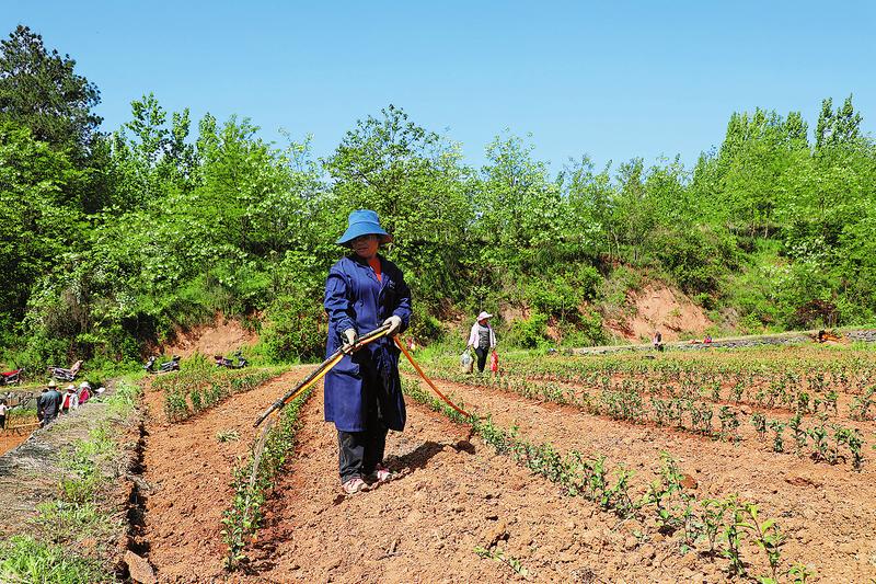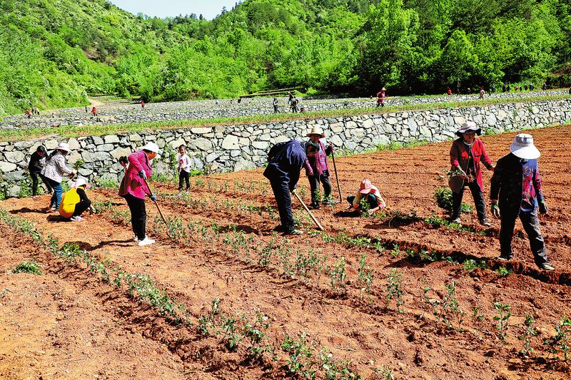 近日,商南縣富水鎮沐河村二組的陳家溝紅茶產業基地,60多名務工群眾正在茶葉基地平整土地、栽植茶苗、澆水覆土。據悉,陳家溝紅茶產業基地今年3月份建成,占地310畝,基地通過土地入股、務工帶動77戶農戶增收。(見習記者韓露攝影報道)