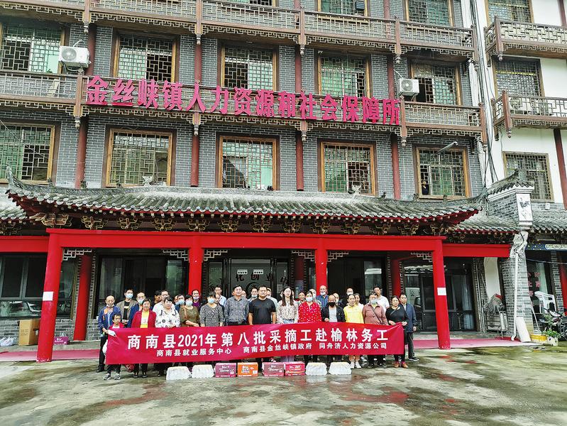 9月5日,商南縣就業服務中心聯合金絲峽鎮人民政府、商洛同舟濟人力資源公司,舉行2021年第八批采摘工赴榆林務工歡送儀式,現場為42名務工人員免費贈送了人身意外傷害保險,發放了生活用品。據悉,這批采摘工將安置到陜西榆林大地種業有限公司,從事兩個半月的撿土豆工作,日均工資150至180元,預計可實現人均增收1.2萬元。(桂青圓 攝)