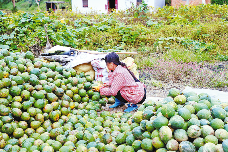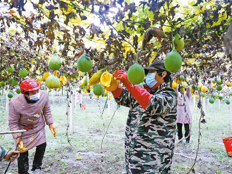店坊河村村民劉湘琴用雙手輕輕一掰,就將藤蔓上瓜蔞分開一條裂縫,麻利地將瓜籽挖出,再將瓜蔞皮一分為二背靠背晾曬在藤上。“成熟的瓜蔞先不著急摘下來,掏出瓜籽后,自然風干的瓜皮可以入藥。”劉湘琴說,“我60多歲了,平時在家干完家務,就到離家不遠的種植基地干點農活,每天有80元的收入。一年四季在家門口干些零星活兒,也能掙幾千元哩!”
