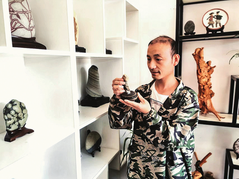 宋偉的房前屋后也成了“奇石收藏館”,室內(nèi)陳列著大大小小、形態(tài)各異的石頭,黃蠟石、蛤蟆豆、長(zhǎng)江紅碧玉、文字石、圖案石等擺件應(yīng)有盡有,琳瑯滿目,讓人眼花繚亂。因?yàn)樗蝹釔?ài)收集純天然石頭,并鉆研石頭手工藝制作,既成就了自己也幫助了別人。在宋偉的幫助下,許多本地、外地愛(ài)好者通過(guò)抖音短視頻聯(lián)系上他。從2017年到現(xiàn)在,先后10多人向宋偉拜師學(xué)藝,也都紛紛靠著石頭走上了發(fā)家致富的道路。