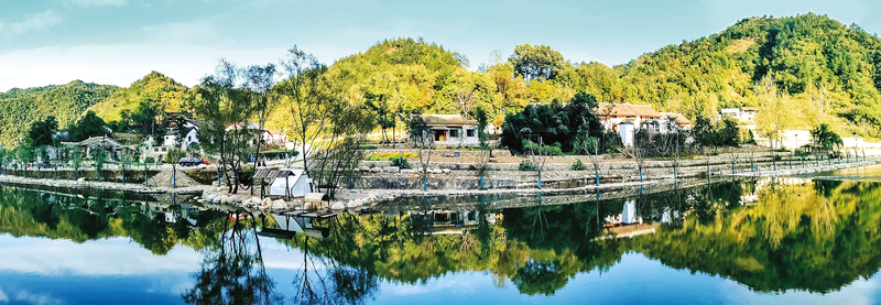 遠(yuǎn)山如黛,近水似玉。如鏡水面上,倒映著綠樹(shù)青瓦白墻以及那淡淡的落日余暉。一葉扁舟劃破水面的寧?kù)o,歡聲笑語(yǔ)回蕩在綠水青山間。