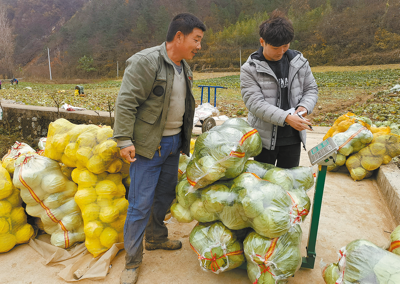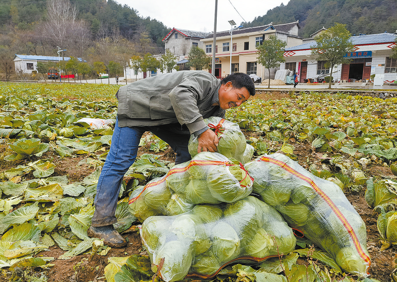 11月9日,走進十里坪鎮梁家墳村種植大戶許少武的包菜地,只見村民正在手腳麻利地對包菜進行采摘、裝袋、搬運、稱重、裝車,地頭不時傳來爽朗的笑聲。