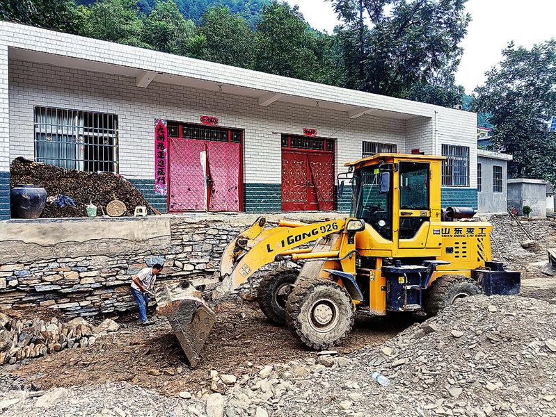 臨近雙寨村村委會的小西溝組也受到了洪水的侵襲。見到村民張平時,他滿身的泥土,正在清理門前的淤泥,用石頭填充地基。張平的房屋距離河道10多米,地基有2米多高,但洪水依然涌上了門前的臺階,墻上仍有泥水的痕跡。“半夜3點多聽到廣播響,我和家人馬上起床,到村委會打地鋪。”張平告訴記者,他家的地基被掏空,豬也被洪水從豬圈里沖了出來,村委會有方便面和水,那就是他們的避難所。此時,張平家對面已經架起了新的電線桿,旁邊斷裂的水泥橋也在進一步修復中。