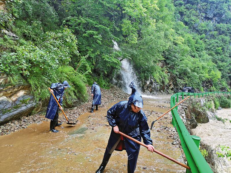 受8月21日晚至22日強降雨天氣影響,山陽縣小河口鎮境內大小河流水量暴漲,轄區主干道出現持續落石塌方,道路堵塞,無法通行。小河口鎮迅速啟動防汛防搶撤工作機制,有序組織鎮村干部群眾開展搶險救災,清理道路落石,搶修電力線路,妥善安置受災群眾。圖為該鎮鐵匠溝村干部群眾冒雨疏通通村公路塌方路段。