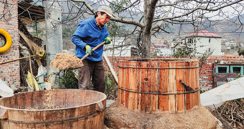 第三代山陽柿子酒非遺傳承人在做示范,將拌好的酒糟放入酒甑中。